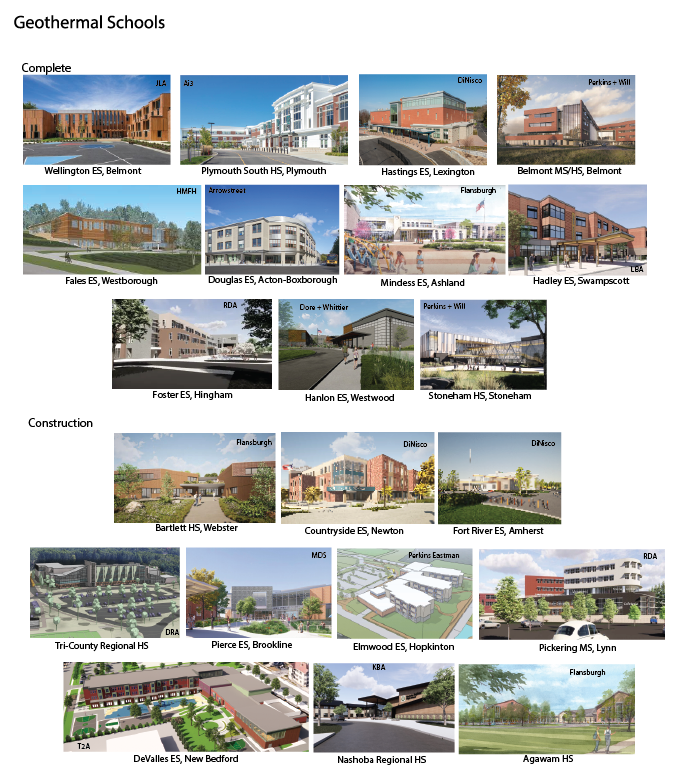 These MSBA projects include a geothermal ground source heat pump system. Virtually all MSBA new construction projects either include photovoltaic systems in the project, are designed to have photovoltaics purchased later by the district, or photovoltaics are installed through a Power-Purchase Agreement by the district after construction. Many projects that include geothermal wells also include photovoltaic panels.